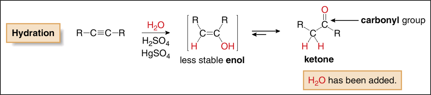 \[\ce{R-C≡C-H ->[H2O/H+/Hg^{2+}] R-C(OH)=CH2}\]התגובה מתרחשת לפי כלל מרקובניקוב - המימן מסתפח לפחמן הפחות מותמר וקבוצת ההידרוקסיל לפחמן היותר מותמר.